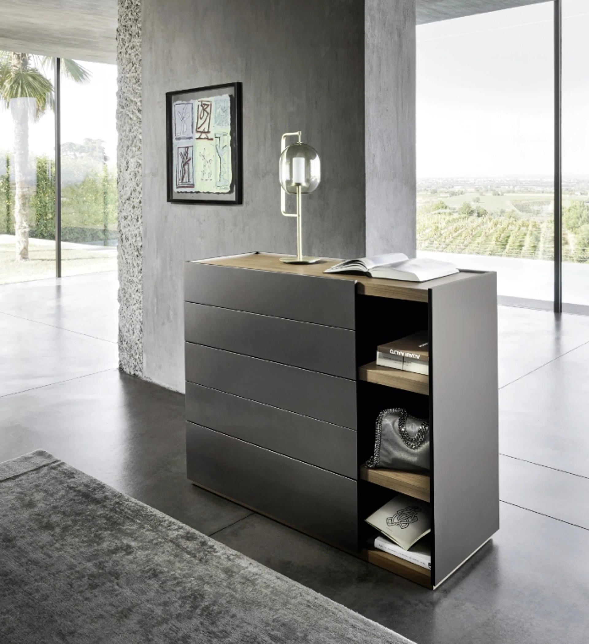 I Comodini sono arredamenti in grado di ultimare la zona notte assicurando una superficie di appoggio sicuramente utile e poliedrico. Ti chiedi come abbinare letti, armadi e comodini? Con il modello di Sangiacomo visibile in foto avrai un arredo studiato per uno spazio dai richiami moderni.