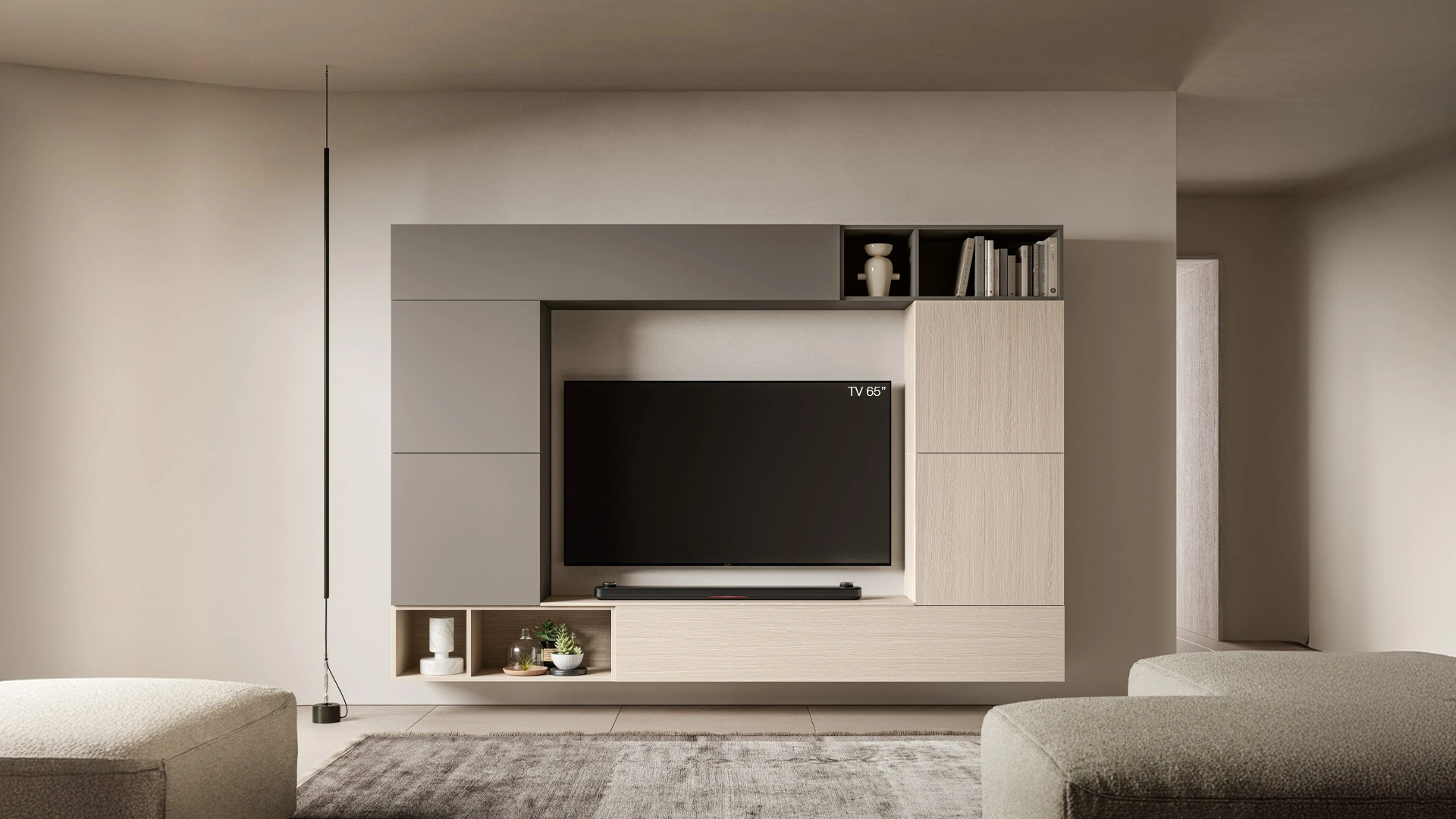 Vuoi progettare un living operativo e pratico? Ti offriamo la parete attrezzata Pratico PTG453 SantaLucia dalle forme decise moderne.
